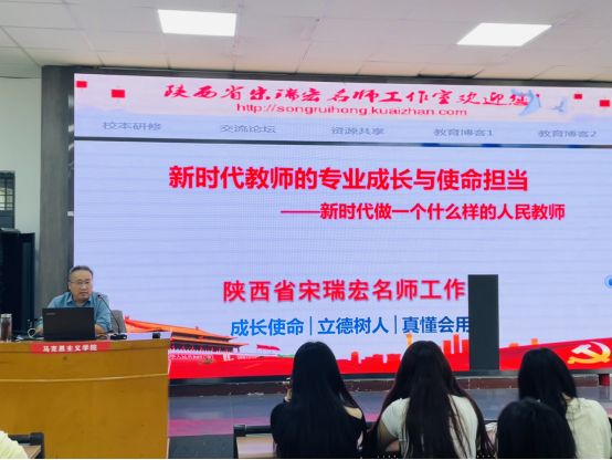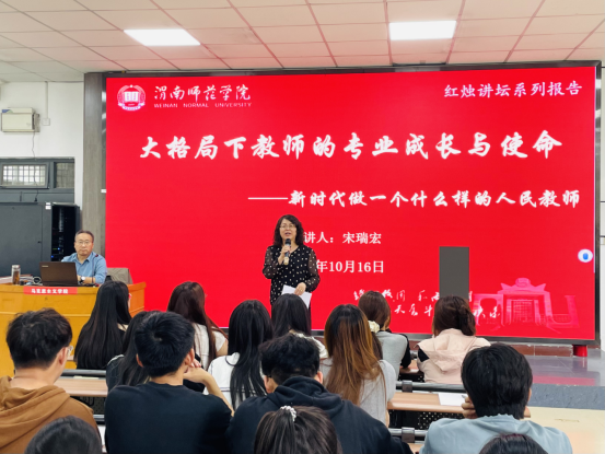 2024年10月16日下午,fun88官网体育邀请陕西三秦英才特支计划教学领军人才、陕西省特级教师、陕西省教学名师宋瑞宏在1101教室作了题为《新时代教师的专业成长与使命担当》的专题报告。fun88官网体育经理张萍、教师代表李昊婧及2023级思想政治教育专业员工参加。报告会由张萍经理主持。