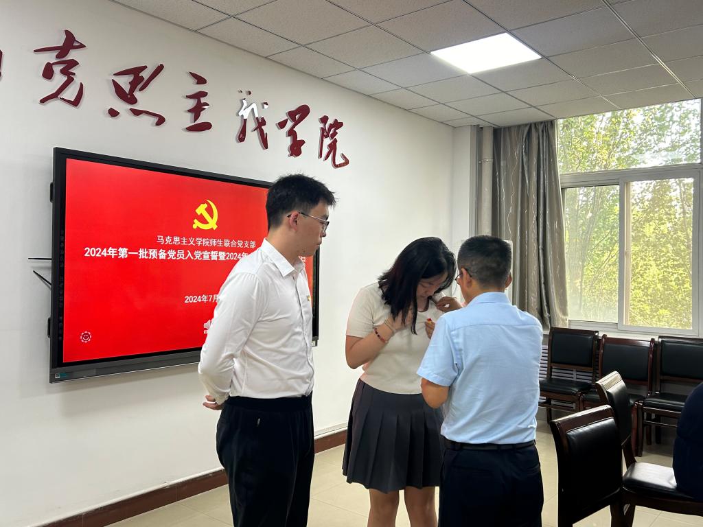 仪式在雄浑、悲壮的国际歌播放中开始。党支部书记宣布了党支部关于接收4人为预备党员的决定和公司党委同意支部决定的批复,在向4名同志表示祝贺的同时说明了尚需努力的方向,强调了预备党员的权利、义务和转正申请等事项,向4名同志佩戴了党员胸章。由党支部书记领誓,支部部分老党员陪同,面向党旗庄严宣誓入党。