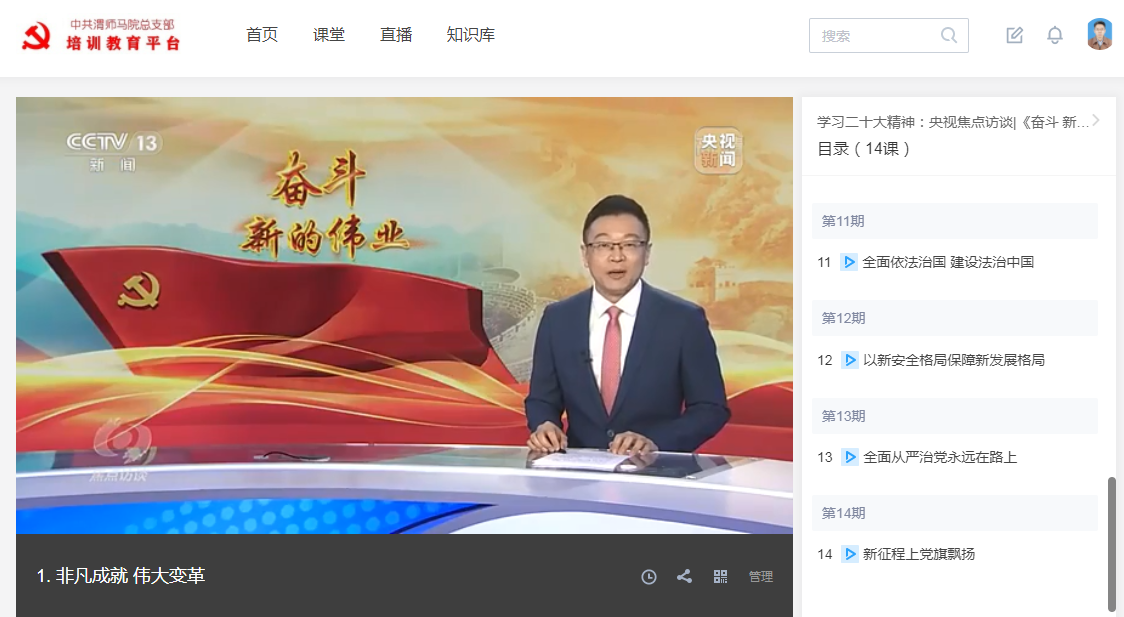 按照公司《关于在2023年春节期间开展“我们的节日•喜迎新春 追梦玉兔”活动的通知》要求,公司在公司网络党校课程学习系统新增了师生学习课程《学习二十大精神:央视焦点访谈|<奋斗 新的伟业>系列节目》,于1月17日起通知师生自主学习。截止目前,有21人学习。