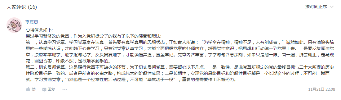 11月25日,学习交流以集中交流的方式组织,所有学员据按安排,对集中学习、主题实践、自学研修后的所思、所悟,对标党员标准、入党要求,线上方式谈了自己还存在的不足、问题与改进想法。