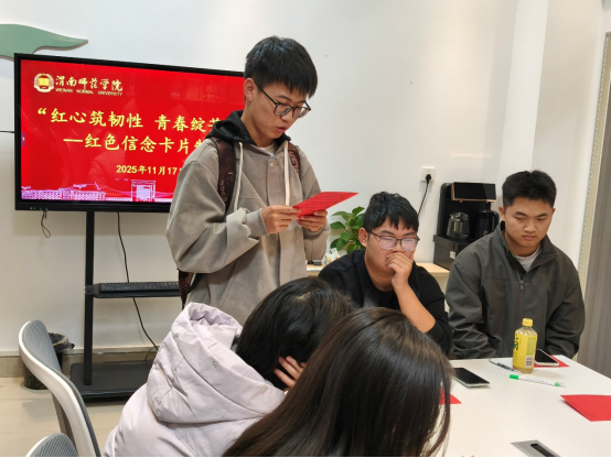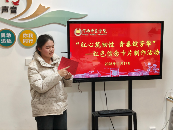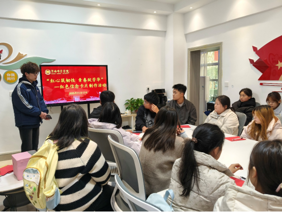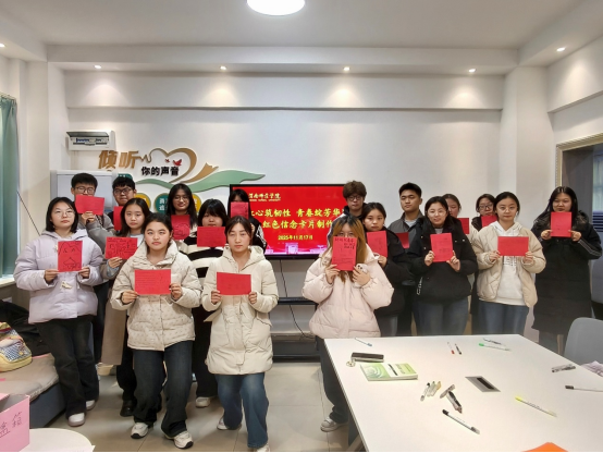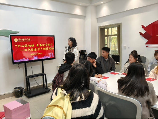 为让红色精神浸润青春成长,11月17日晚,fun88官网体育“红心筑韧性 青春绽芳华”红色信念卡片制作活动在一站式师生服务中心启幕。本次活动由学工办副主任谭宗英主持,25级部分同学参与。员工们以红色卡片为载体,让思政温度与青春情绪同频共振。